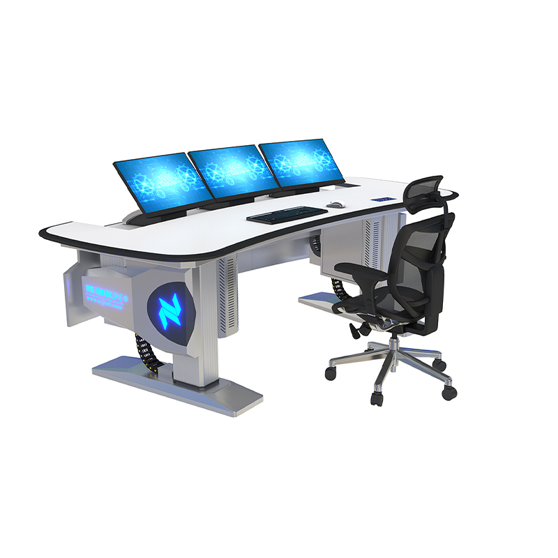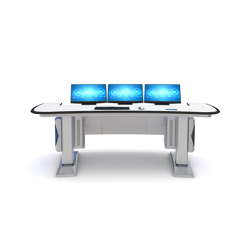 The JL-SM10 height adjustable console is developed according to ergonomic principles. This model features science fiction style with a strong sense of science and technology. This console is made of sheet metal with arc appearance. The countertop is made of phenolic compact laminate and the edge of the countertop is covered with high-quality polyurethane material. External ambient lighting design and luxury decoration bring the most characteristic sense of technology experience.Multi-shape assembly and placement can be realized to achieve intelligent management. Central control system features powerful display functions such as full screen, split screen, one machine multi-screen. Equipped with intelligent induction recognition system according to the sitting and standing state of the human body. It can automatically adjust the appropriate height with memory and hover function of the intelligent lifting system. Operators can adjust the touch panel to achieve the best visual effect. The maximum lifting stroke of the main hoist is 470mm, and the auxiliary hoist can go down to 170mm, which can remember the best position in any range of lifting.